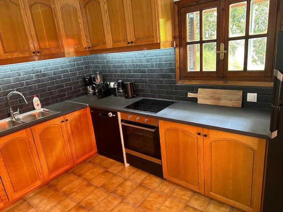 The villa with a terrace and garden views features 3 bedrooms, a living room, a flat-screen TV, an equipped kitchen with a dishwasher and an oven, and 2 bathrooms with a hot tub. The parquet floors, fireplace and peaceful vibe add to the ambience of the room. The property has an outdoor dining area.