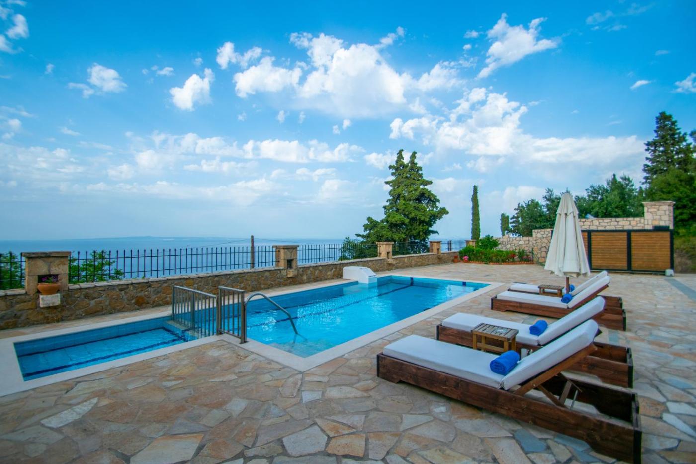 Villa with Private Pool. Guests will have a special experience as this villa features a pool with a view and a fireplace. Featuring a private entrance, this air-conditioned villa is comprised of 1 living room, 3 separate bedrooms and 3 bathrooms with a bath and a shower. Guests will find a stovetop, a refrigerator, a dishwasher and kitchenware in the well-fitted kitchen. The villa also has a barbecue. The spacious villa offers a washing machine, soundproof walls, a minibar as well as a terrace with sea views. The unit offers 7 beds.